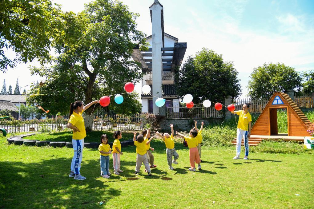 9月5日,四川泸州白酒产业园区天骄托育园的老师带领孩子们做游戏。新华社记者 江宏景 摄